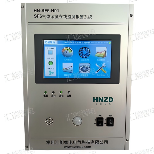 SF6监测主机包括CPU主控单元、报警单元、通信单元、显示单元和通风控制单元。通过与现场的各检测器相连接,能精准的接收检测器传送过来的检测数据,通过运算分析,判断是否超标,超标则进行声光报警、启动风机等输出动作,主机采用彩色触摸屏,用于显示现场测量的实时数据,还可与键盘联合作业,进行历史数据查询、系统时间设置、定时启动风机设置等操作,操作界面简单、友好,还具有手动启动风机功能,采用挂壁式安装方式。